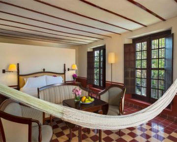 Retírese a un paraíso tropical en las habitaciones de nuestro hotel estilo boutique en Hacienda Puerta Campeche, a Luxury Collection Hotel, Campeche. Nuestras amplias habitaciones y suites están situadas dentro de los edificios originales de la hacienda, completamente restaurados, y combinan la decoración tradicional de esta cultura con instalaciones modernas. Rodéese de techos de más de cinco metros de altura, puertas dobles de madera y suelos de azulejos mexicanos en tonos teja y azul cerúleo. Todas las habitaciones cuentan con acceso WiFi gratuito y servicio de habitaciones de nuestro restaurante internacional. Duerma plácidamente en nuestras camas lujosas y exclusivas o en una de las hamacas de tela de algodón estilo maya que cuelgan de las paredes de piedra de las habitaciones.